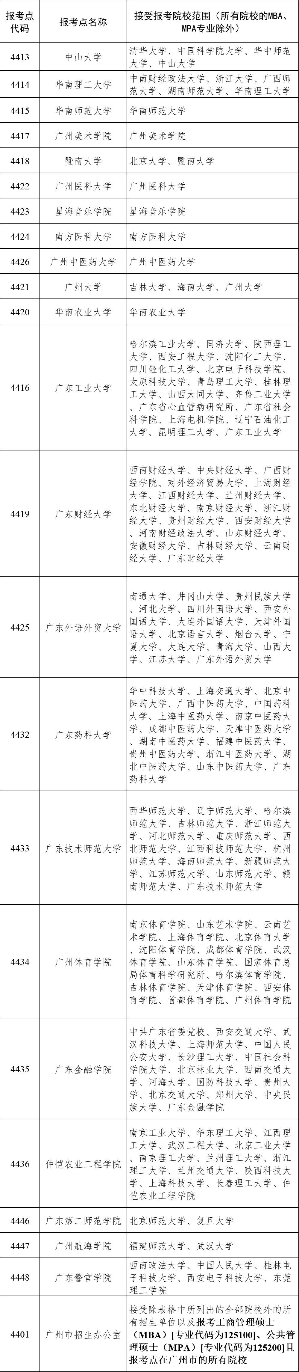 报考工商管理硕士(MBA)[专业代码为125100]、公共管理硕士(MPA)[专业代码为125200],且户籍或学习、工作地点在广州市的考生可在本报考点报名(不受上述表格列出招生单位的限制)。
